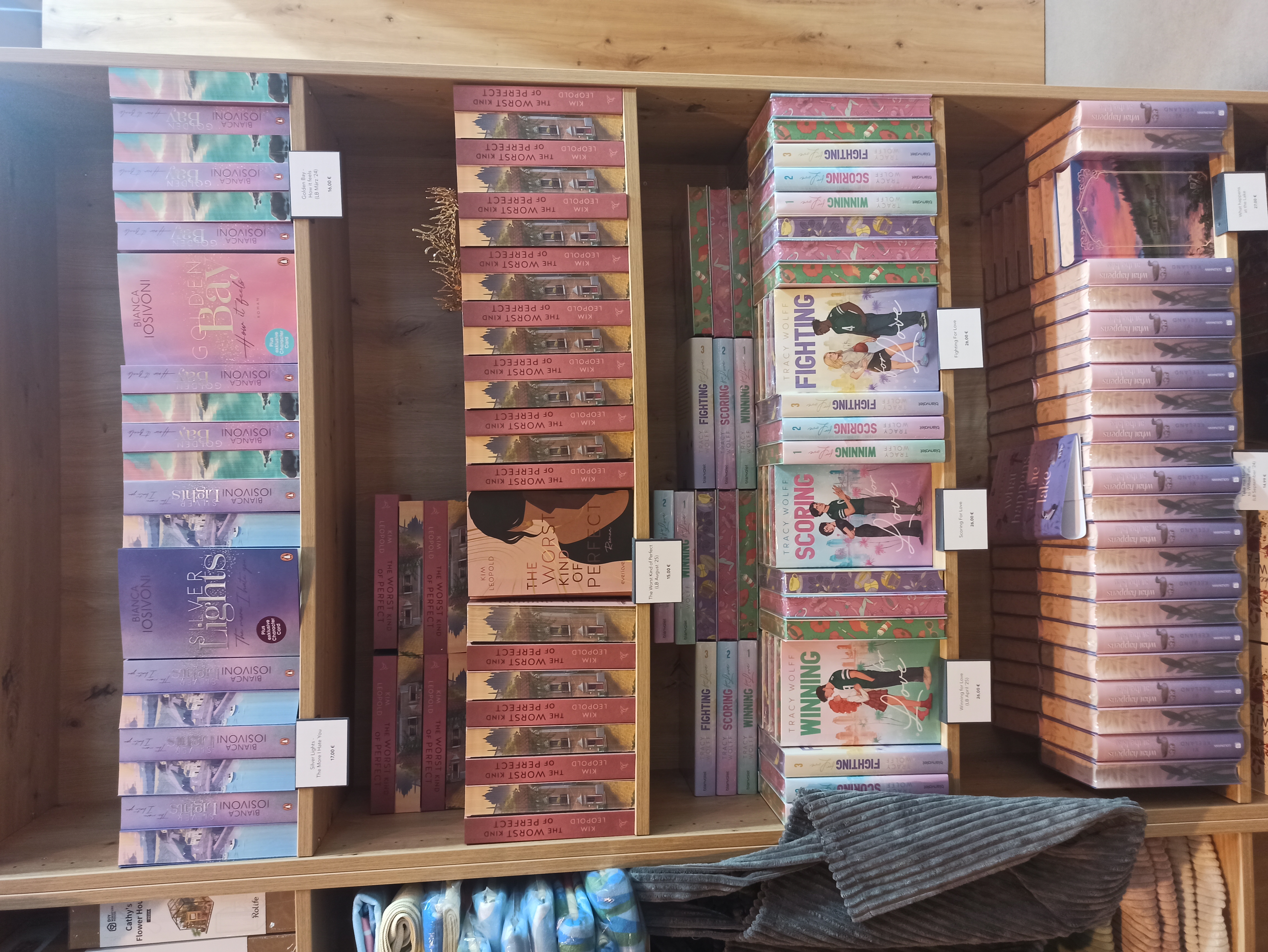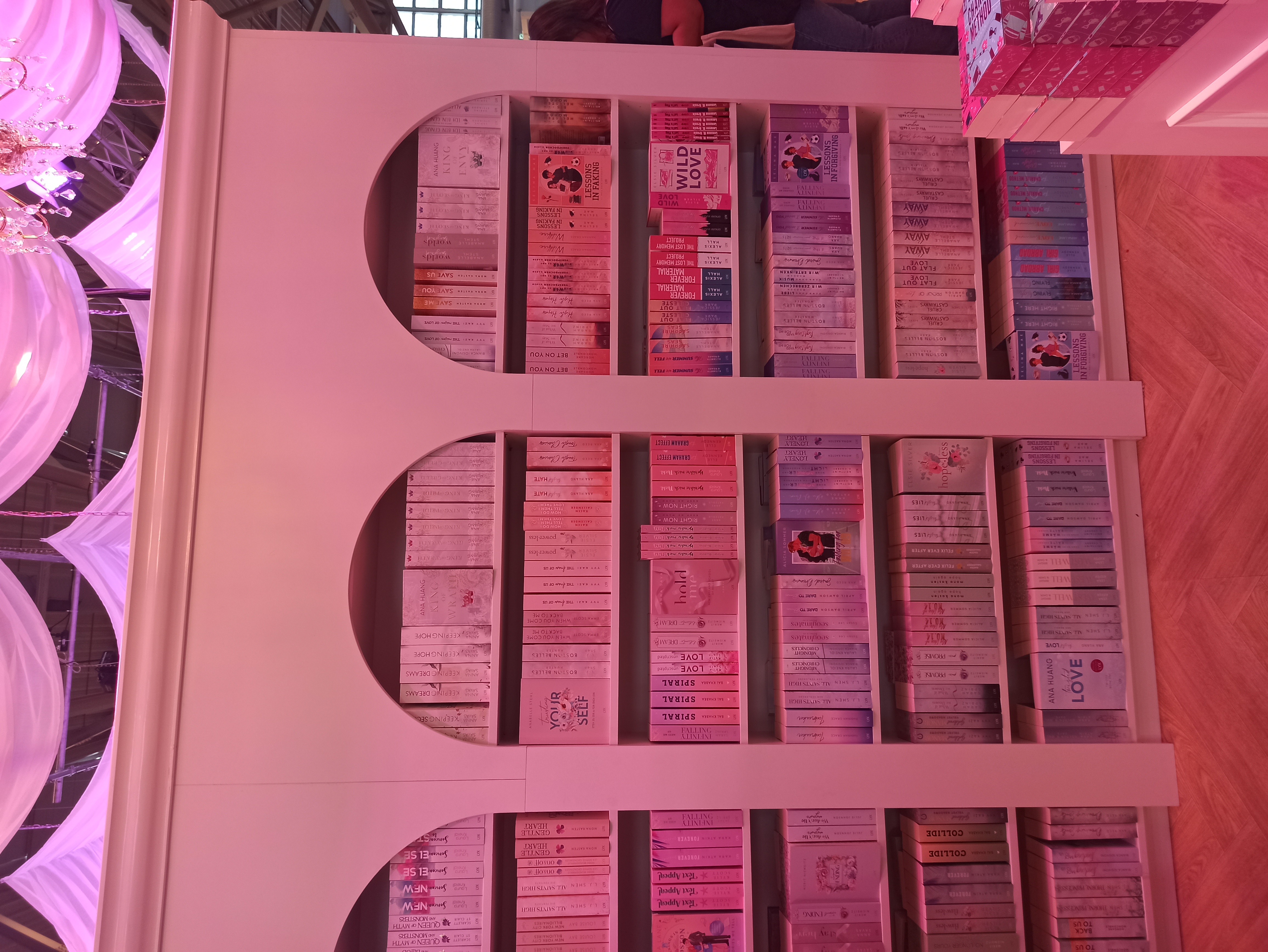 Nach diesem entspannten Start trennten sich unsere Wege. Ich machte mich auf in Halle 1.2, um mir das New-Adult-Angebot anzuschauen und gleichzeitig noch etwas Videomaterial für mein Reel zu sammeln. Mir fiel sofort auf, wie viel Mühe sich die Stände bei der Gestaltung gegeben hatten. Die Buchhandlung Graff hatte gleich links vom Eingangsbereich viele tolle Bücher mit aufwendigen Farbschnitten in ihren Regalen ausgestellt und Jutebeutel mit Tiermotiven wie dem »Bookxolotl« aufgehängt, die direkt ins Auge stachen. Auch bei der Bücherbüchse, die bekannt für ihre Exklusivausgaben ist, konnte man einige New-Adult-Neuheiten ergattern, darunter The Worst Kind of Perfect von Kim Leopold. Ein Roman, der Themen behandelt, durch die sich das Genre unter anderem auszeichnet: tiefe Emotionen, der Wunsch nach Selbstverwirklichung und Authentizität. Kaum zu übersehen war der LYX-Stand in der Hallenmitte, der sich im Vergleich zum vergangenen Jahr mit seiner Liebe zum Detail noch einmal selbst übertroffen hatte. Kronleuchter und Stoffbahnen hingen von der Decke, alles war in ein rosiges Licht getaucht und die Bücher waren farblich abgestimmt in arkadenähnlichen Regalen arrangiert. Darüber hinaus konnte man zahlreiche Goodies wie Tassen, Charms, Sticker, Pins und Charakterkarten kaufen. Ausgelegt war auch Gentle Heart, der dritte Band der Scarlet-Luck-Reihe von Mona Kasten, der wohl erfolgreichsten deutschen New-Adult-Autorin. Während ich mich für kurze Zeit treiben ließ, begegnete ich ihr zufällig bei einer Signierstunde, was für mich ein besonders schönes Highlight war – Ich kann mich nämlich noch daran erinnern, wie ihr Debütroman Schattentraum – Hinter der Finsternis 2014 erschienen ist und wie viel sich seither für sie verändert hat (zum Positiven, versteht sich).