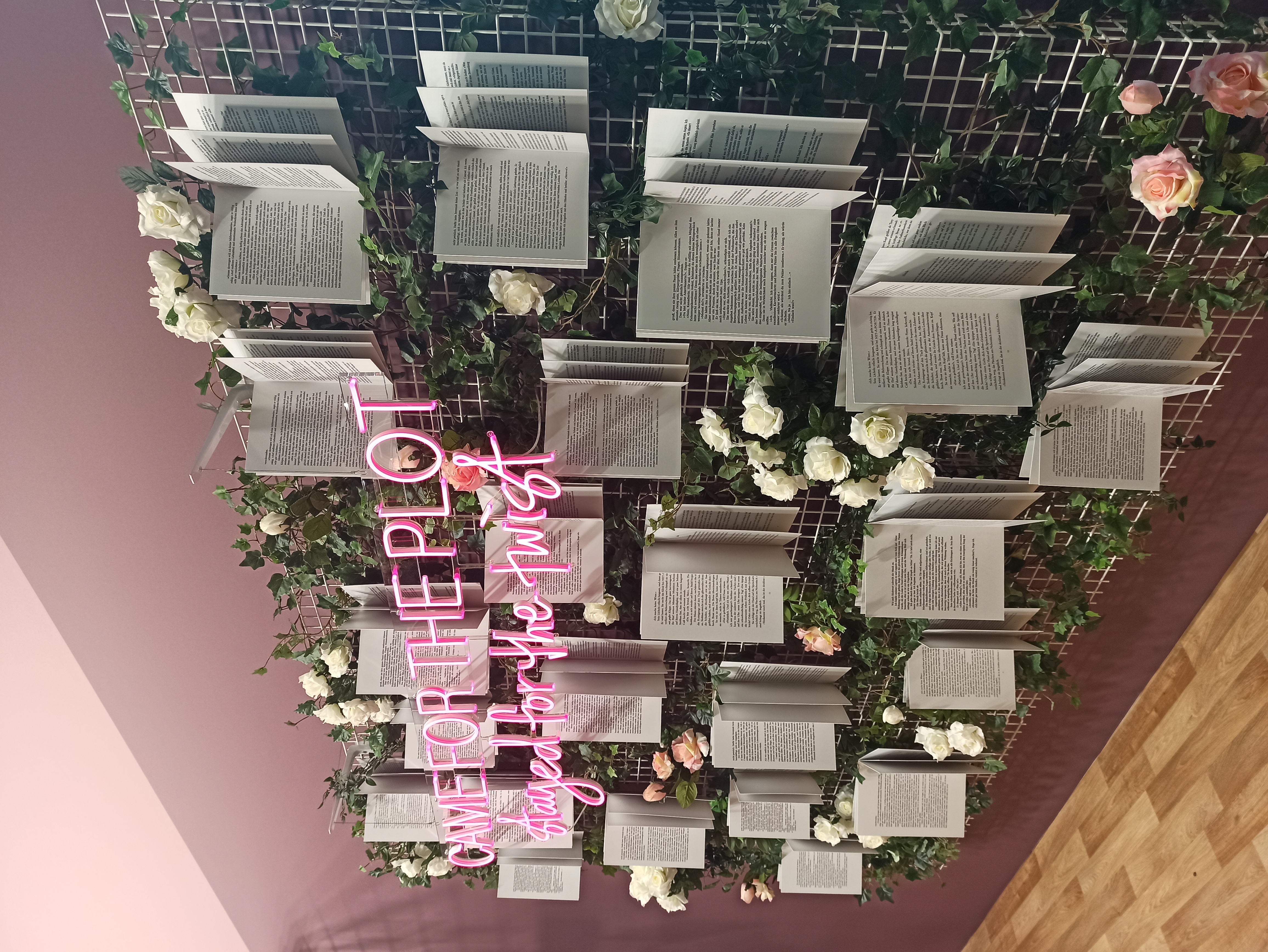 Zwischendurch entdeckte ich auch immer wieder kunstvoll gestaltete Fotospots. Beim Penguin Verlag beispielsweise gab es einen Bücherbogen, daneben Karten, die mit verschiedenen Tropes beschriftet waren. Wer sich hier seine Lieblingstropes von der Wand nahm bekam passend dazu eine exklusive Buchempfehlung. Auch in Halle 3, in der vor allem aktuelle Gegenwartsliteratur asugestellt wurde, waren mehrere Fotospots aufgebaut. Insbesondere Thalia hatte sich mit einer Sitzgelegenheit in Form zweier riesiger Bücher, schwebenden Buchseiten und einer Fotowand mit dem Satz »Came for the plot, stayed for the twist« ins Zeug gelegt. Dieses Motto passte irgendwie auch gut zur Messe selbst. Ich ließ mich gerne überraschen, sowohl von Neuerscheinungen als auch von bekannten Namen. So etwa fand ich einige Romane von Gabriella Santos de Lima, die erst vor Kurzem mit einer New-Adult-Lesung beim LZG zu Gast war.