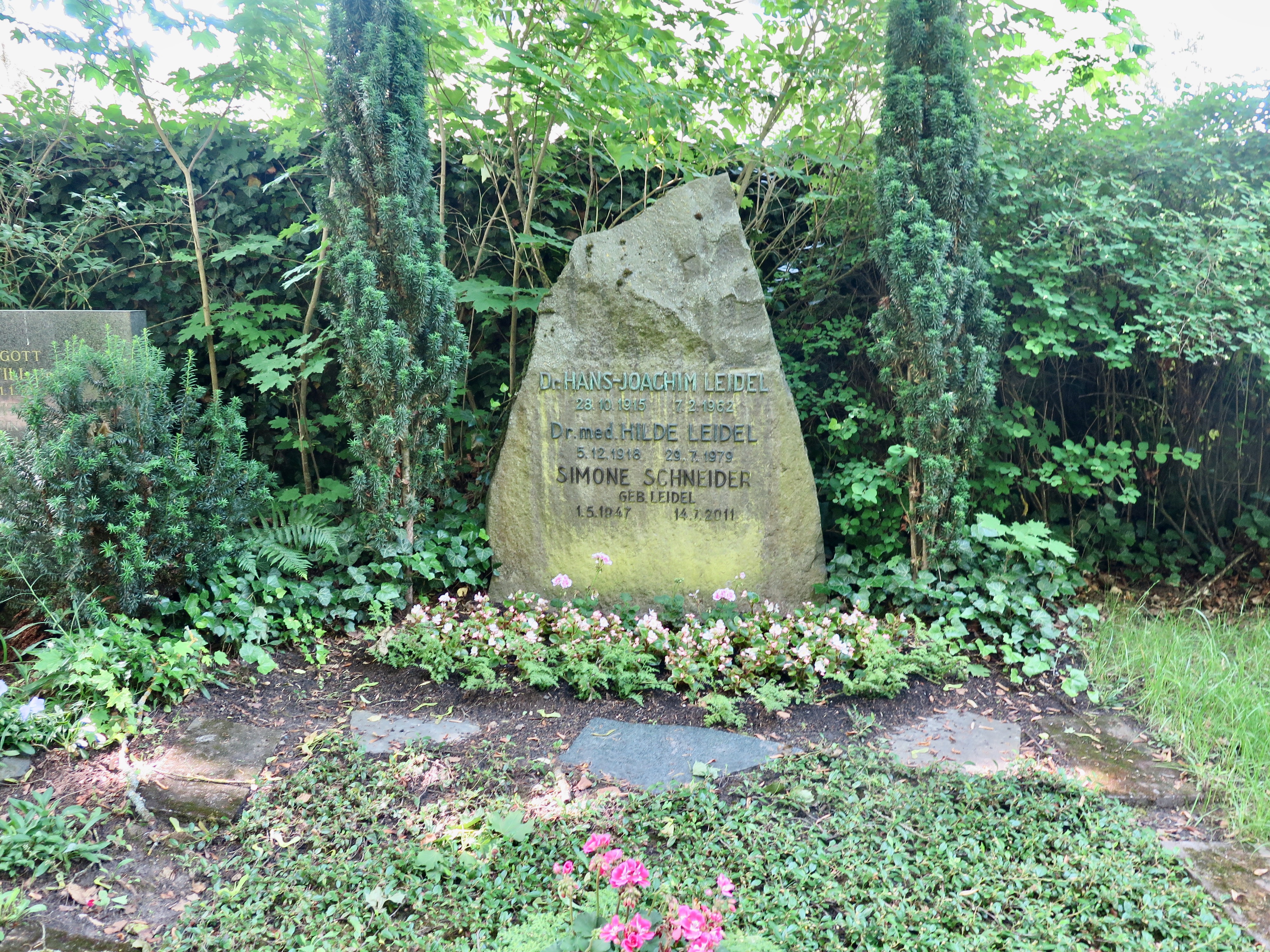 Direkt an der Mauer ist ein Grabstein für das Ehepaar Hans Joachim und Hilde Leidel. Dank Internetrecherche ließ sich schnell klären, dass es sich um den Gießener Dichter handelt, dessen Werk der frühere Buchhändler und Verleger Gideon Schüler in einem Buch würdigte. Zudem hat Hans Joachim Leidel einen recht umfänglichen Eintrag auf Wikipedia; dort werden seine Berufe Arzt und Schriftsteller genannt, und sein Bezug zu Gießen erklärt.