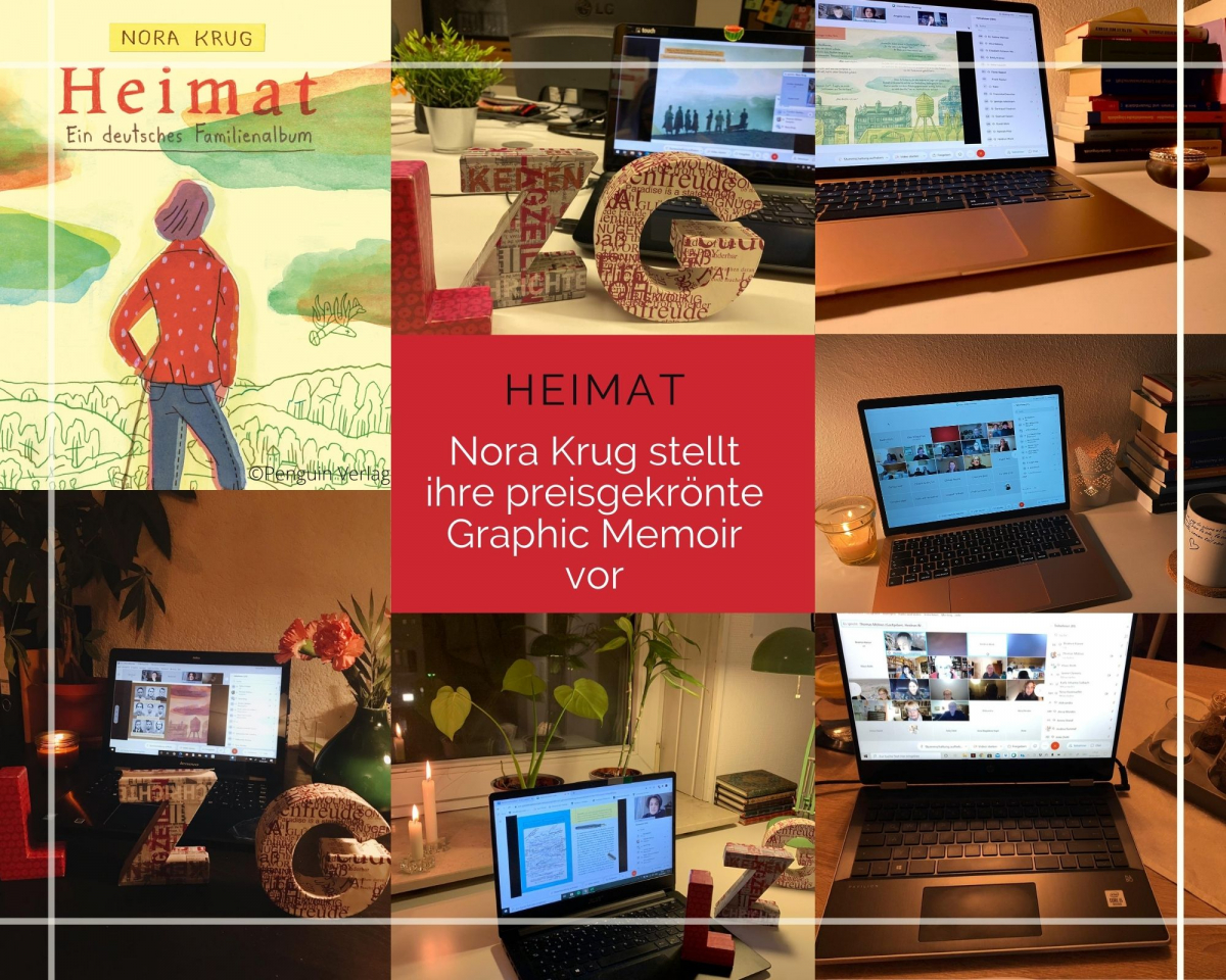 Nach einer kurzen Vorstellung der Autorin seitens der Moderation begann Nora Krug über ihre 2018 erschienene Graphic Memoir Heimat zu berichten und las ausgewählte Passagen aus selbigem vor. Mittels eines geteilten Bildschirms konnten hierbei einzelne Seiten des Werkes betrachtet und mitgelesen werden. Besonders eindrucksvoll war dies aufgrund der vielfach angebrachten Zeichnungen und Fotos, welche das Werk ausmachen. Von Einträgen über »typisch deutsche« Dinge, die Nostalgie hervorrufen, bis hin zu Erfahrungsberichten, Veränderungen in der Sprache und dem Aufarbeiten der Vergangenheit findet sich vieles in Heimat, über das in Bezug auf Deutschland während des Hitler-Regiments und der nachfolgenden Zeit geschrieben werden kann. Flucht, Leid und Tod werden aufgegriffen, die Perspektive ist jedoch eine weniger distanzierte als in vielen anderen Werken zum Thema. Gefühle spielen eine wichtige Rolle, ebenso wie die Frage, was eigentlich Heimat ist, wodurch diese gekennzeichnet ist und was man mit dem Begriff verbindet.