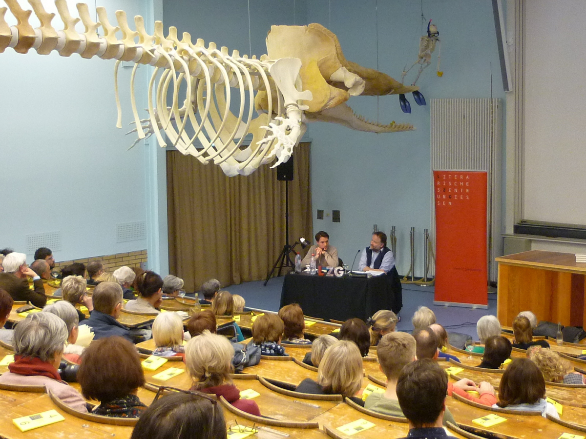 Am Mittwoch, den 27.3., las Anselm Oelze vor einer ganz besonderen Kulisse. Durch einen schummrigen Flur, erhellt nur von den Gemälden fluoreszierender Meeresbewohner, gelangten die zahlreichen Zuhörer*innen in den Hörsaal der Hermann-Hoffmann-Akademie. Dort fanden sie sich unter dem beeindruckenden Skelett des jungen Pottwals wieder, das seit Anfang des Jahres über den Sitzreihen hängt. Genau der richtige Ort, um Oelzes Romandebüt Wallace zu lauschen, in dem er die Geschichte des Artensammlers Alfred Russel Wallace erzählt. Zeitgleich mit Charles Darwin lüftete der Sammler das Geheimnis um die Entstehung der Arten. Den Ruhm dafür jedoch erntete nur Darwin, Wallace blieb weitgehend unbekannt.